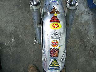 これが車検合格のステッカー、このステッカーをみると参加履歴が一目でわかります。長く参加していると、だんだんステッカーの貼付場所がなくなってきます