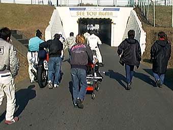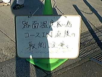 非常に寒くタイヤ温度が上がらず毎年転倒車が続出するため、このような注意書きがピットロード入り口にあった。