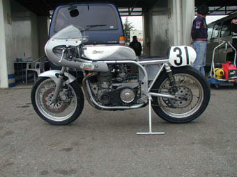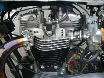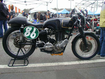 浅場トライアンフのきれいなエンジン。以前はノートンやトライアンフなどのきれいに仕上がったエンジンがパドックにあふれていたが、最近はゴミ箱から拾ってきたようなCB750が増えて華やかさが無くなりつつあります。