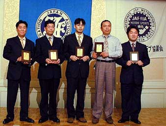 敏幸の各選手、 ラリー2駆Bクラスナビゲーター部門左からプレゼンティーターの溝部さん、チャンプ加藤