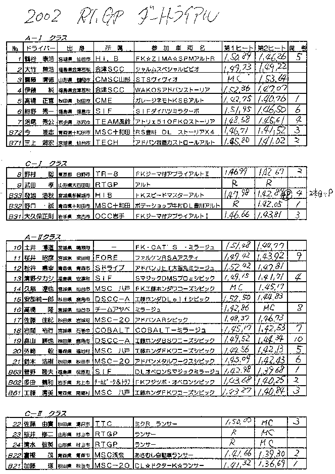 好天に恵まれた4月28日、山形県の大石田スポーツランドでRTGPダートトライアル in 山形が開催され当日は技術委員長として朝の車検から2トライ終了後の再車検まで手伝いました。 実質上のB地区第1戦となった今大会は、天気にも恵まれて東北各地からトップクラスの選手が大挙しての参加で、ハイレベルな戦いとなりA1では久々に参加の高椅選手が昨年チャンプの三上選手を下し優勝、A2は常勝の工藤選手が菅野選手に1秒近く離されて破れ、A4では立花、今野、伊藤の各ベテラン選手を福島の武田選手が破り僅差で競り勝ちし全体的に若い選手が頑張ってました。 今年の地区戦参加者は主催上問題の大きい第1戦と第6戦を省いた残りのイベントでのポイント争いをしており、東北のダートラ選手の良識が高いことを証明したかたちとなりました。 RTGP:ラリーチームグランドプロジェクトの略称、現存する山形県内のクラブでは最古参になる。村山市に活動の本拠を置くラリーとダートラのクラブ