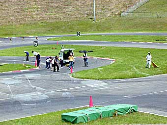 競技中コースにオイルをまいた車両があり猛暑のなかオフィシャルは手際よく石灰処理に大活躍。
