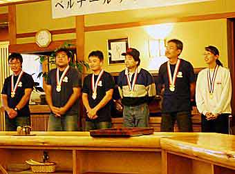 今回も生け簀の前で表彰式です。生け簀には今でもヒラメがいるのか気になります。